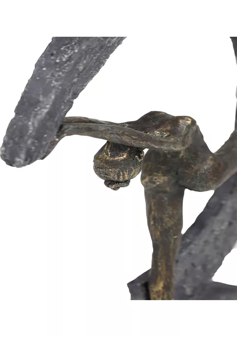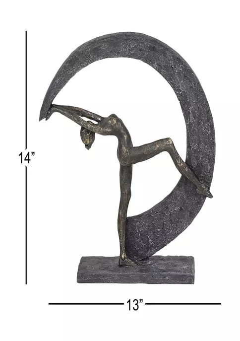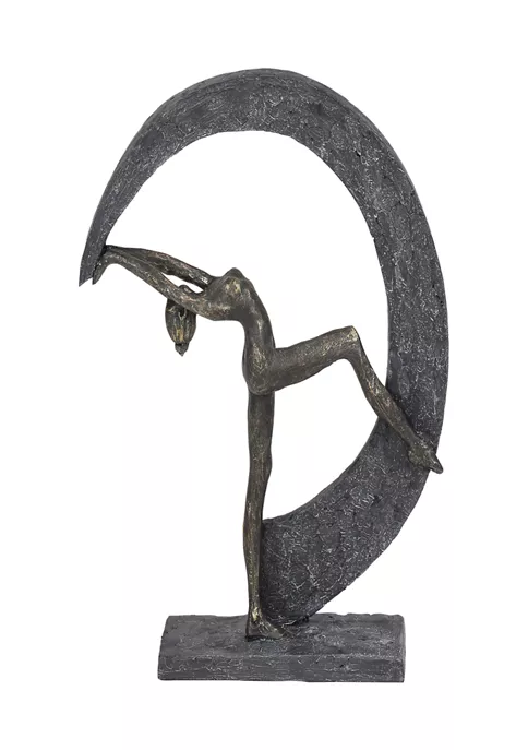 Modern style inspired with a minimalist design. This sleek sculptures is crafted of solid resin and painted dark gray with a metallic gold finish. The rigid crescent moon shape is a distressed stone-like gray hue and texture and features a detailed dancer figurine with its graceful movements made visible.