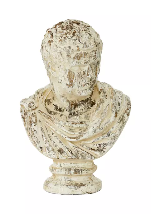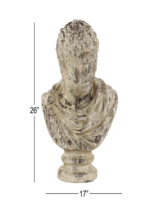 This bust sculpture measures 17 in L x 14 in W x 26 in H and weighs 16.55 lb; base measures 1 in x 9 in