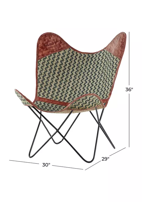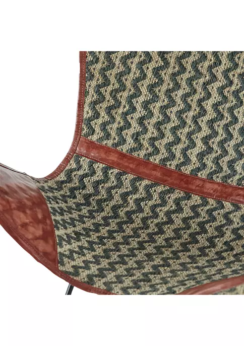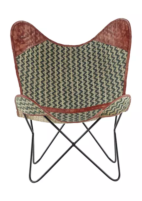 Designed with a rustic influence that can seamlessly transition to farmhouse, bohemian, and eclectic style interiors. High back side lounge chair is crafted from metal, leather and canvas. Butterfly style accent chair has shades of beige, gray, and red brown finish and black metal base. Leather and metal butterfly chair features detailing stitching with zig zag design, wide seat and high back with low profile design on hair pin style leg frame. A butterfly chair measuring 30.38”L x 28.50”W x 36”H and weighs 16.50 lbs