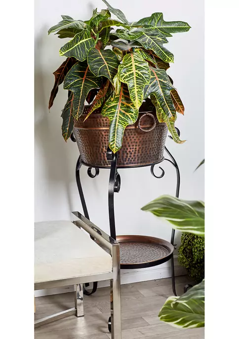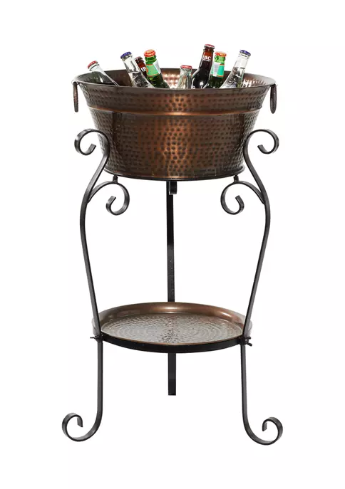 Features a copper finish on the metal material made from durable metal. Features an extra large bucket for better ice and bottle accommodation. Can also work as a beautiful planter. Features a tripod leg design. Wine Country sheet metal wine cooler and stand with tray, tarnished copper-finish round aluminum hand-dimpled style short bucket with ring handles, three-footed black sheet metal band stand with affixed lower round copper-finish dimpled tray.