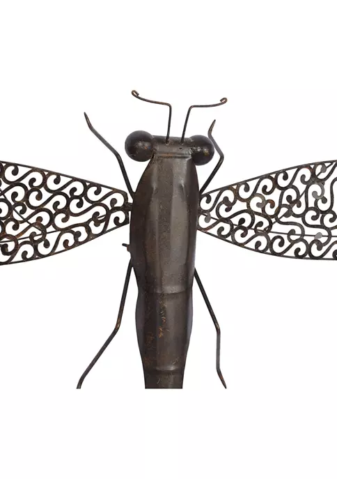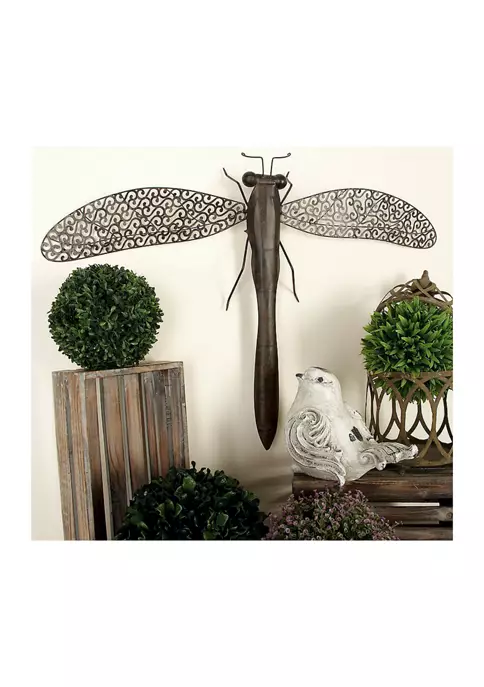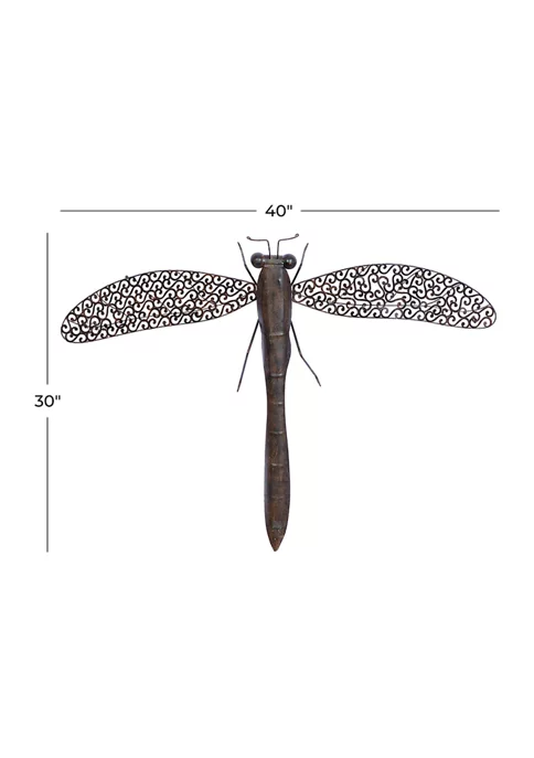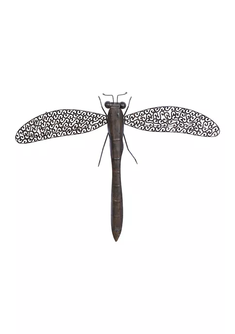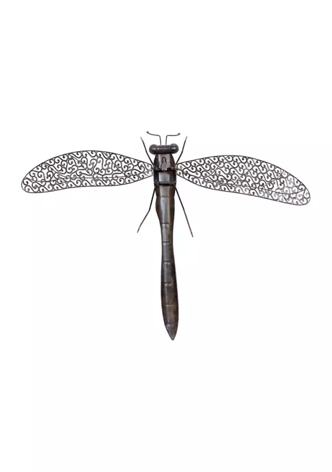 A rustic inspired piece is natural in design, and fills the home with a relaxed and warm ambiance. Item made of iron for solid and sturdy structure. This metal dragonfly wall sculpture features a textured bronze finish. Beautifully designed with filigree scroll wings with detailed body, wings, legs, and antennae. Item measures 40”L x 2.5”W x 30”H, weight 3.69 lbs.