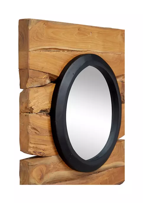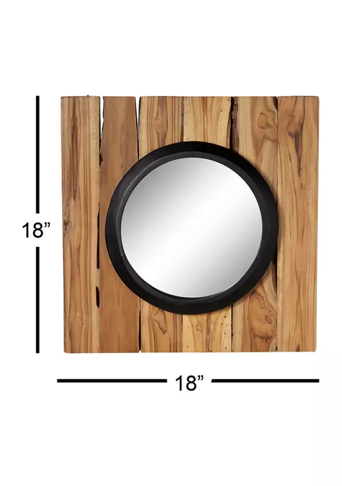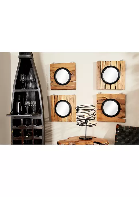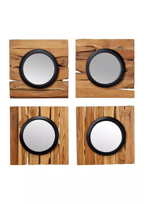 Reclaimed wood decorative wall decor: Each teak wood hanging mirror is made of 100% reclaimed wood, providing you both artistic and sustainable wall decorVersatile, unique statement pieces: The organic character of the wood, natural brown hues of the wood, and the wood grain in each piece is one of a kind and will vary; hang as a set or separate as stand-alone stunning wood wall decorEasy to hang wall mirrors: Each square frame with a circular mirror measures 18โ x 18โ and all collectively weigh 36.5 lbs.; securely hang by the D-rings on the back of each frame
