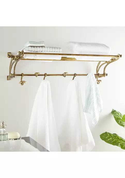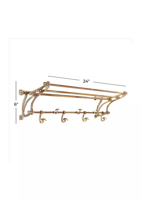 Small, vertical aluminum wall shelf with bronze-finish barsBrass aluminum made from IndiaModern vertical wall hook shelf coated in bronze goes well with rustic themed settingSmall bar shelf measures 24″W x 6″HSmooth aluminum bar for practical use fit for rustic and contemporary spaces