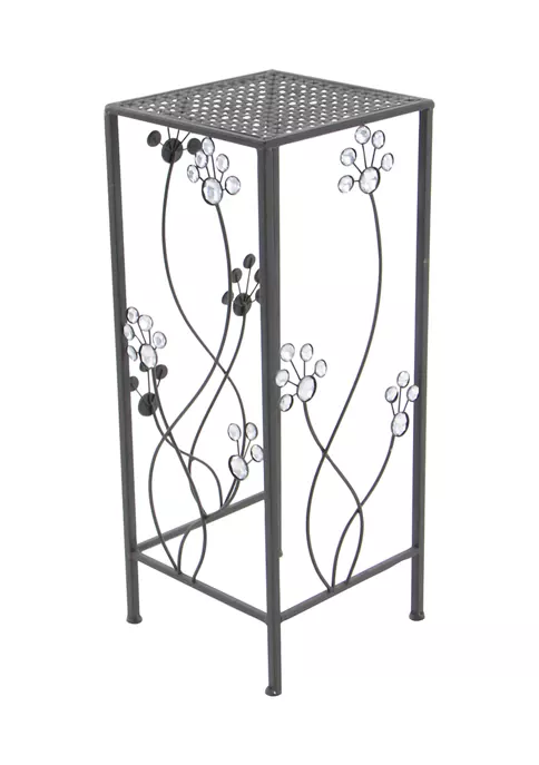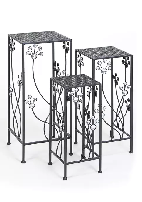 Add traditional glamour to your indoor or outdoor garden with this 3-piece set of square black metal planter stands. The decorative construction features metal vine and flower sculptures with reflective clear acrylic crystal accents. These plant holders are sturdy yet lightweight, made entirely of iron, aside from the acrylic crystals. Each square top has a metal waffle grid to let any water overflow drip through. These stylish nesting garden tables are safe in any weather, so you can display botanicals on the porch, patio, or greenhouse garden. These delightful plantstands can work together as a set or can be displayed as solo decorative pieces all around the garden and patio space. Features sturdy footed legs with circular band braces. Wipe clean with a dry cloth. Suitable for indoor and outdoor use. These stunning plantstands come in a set of 3. Traditional style. This item comes shipped in one carton. Maximum weight limit is 5 lbs. per shelf.