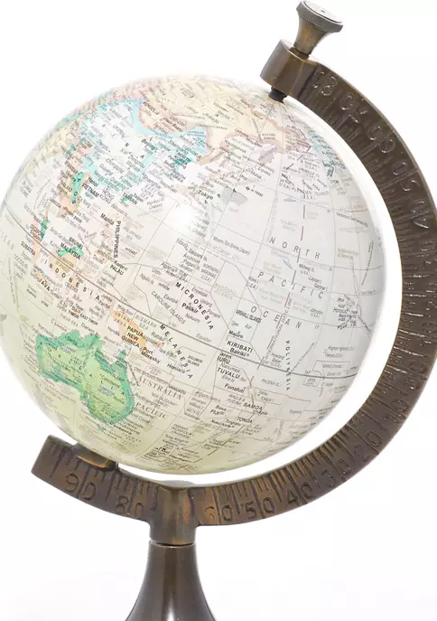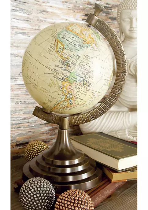 A classic and timeless style of design for your traditional home setting. A copper round spinning globe crafted of robust and lasting aluminum material. This aluminum decorative globe comes in a copper finish that suits any traditional-inspired interior design. A decorative globe with stand featuring a round orb with topographical map, axis with engraved numbers and marks, and round tiered base. Item measures 9″L X 8″W 8″H; and weighs 3 lbs
