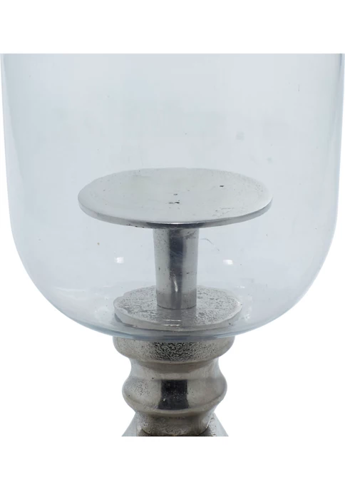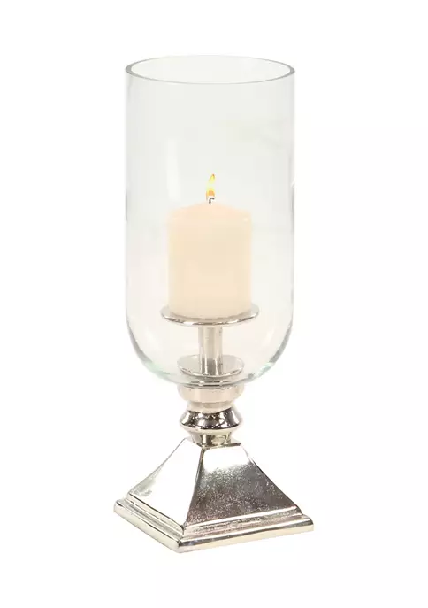 A classic and timeless style of design for your traditional home setting. This decorative candle holder for indoors is constructed of robust and lasting aluminum and glass materials. Polished silver metal base, transparent wide cylindrical hurricane glass. This hurricane candle holder features a clear glass holder and silver aluminum pyramid base. Large hurricane glass pillar candle holder measures 6″L x 6″W x 17″H and weighs 3.5 lbs