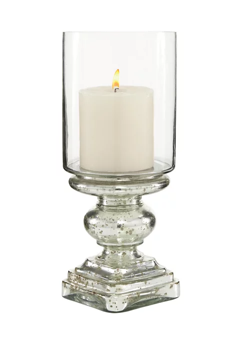 A traditional inspired designed for classic harmony full of friendly charmThis candle holder is made of a solid glass for solid structureSpeckled metallic silver candle holder baseSpeckled metallic silver candle holder base with a turned column silhouette and transparent large hurricane glass coverMeasures 6″L x 6″W x 16″H and weighs 3 lbs