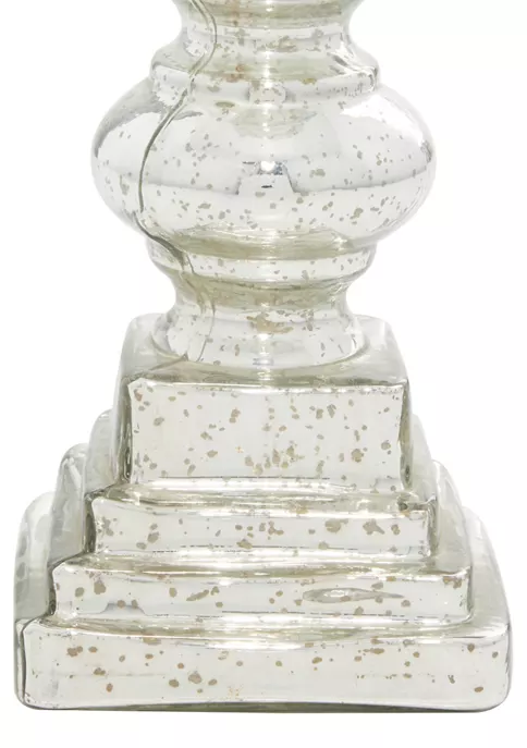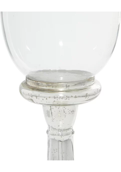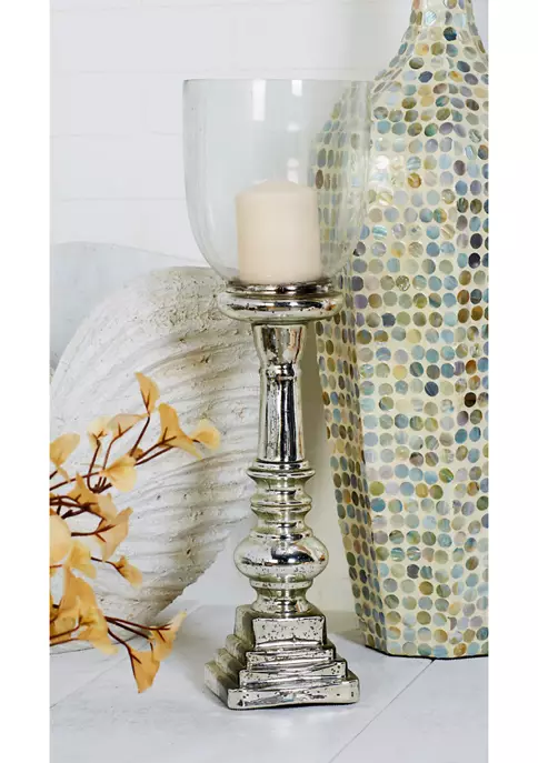 A traditional inspired designed for classic harmony full of friendly charmCrafted of a solid glass for durabilityMetallic silver finish with decorative dark spotting from mercury glass creates a metal lookMetallic silver finish with decorative dark spotting from mercury glass creates a metal look; turned column inspired by antique woodwork; hurricane glass candle cover (candle not included)Large candle holder measures 7”L x 7”W x 22”H and weighs 4.4 lbs