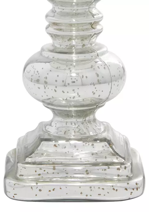 A traditional inspired designed for classic harmony full of friendly charmCrafted of a solid glass for durabilitySpeckled metallic silver candle holder base with a turned column silhouette and transparent large hurricane glass coverSpeckled metallic silver candle holder base with a turned column silhouette and transparent large hurricane glass coverMeasures 6″L x 6″W x 14″H and weighs 13 lbs