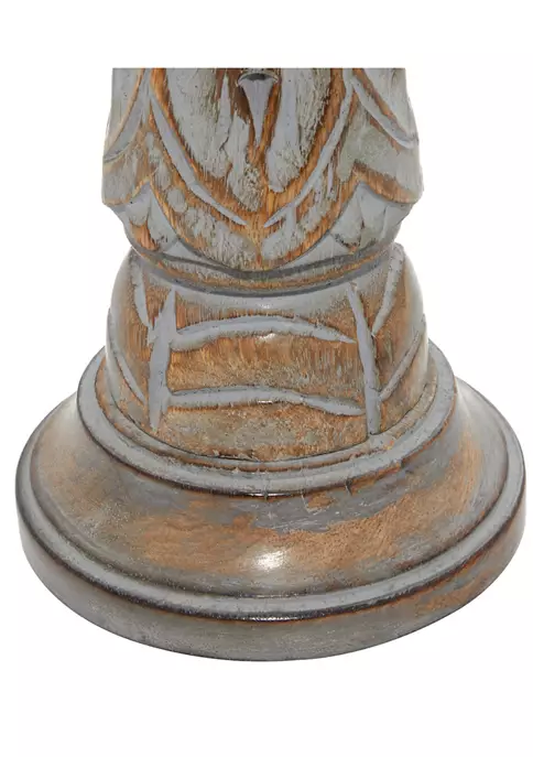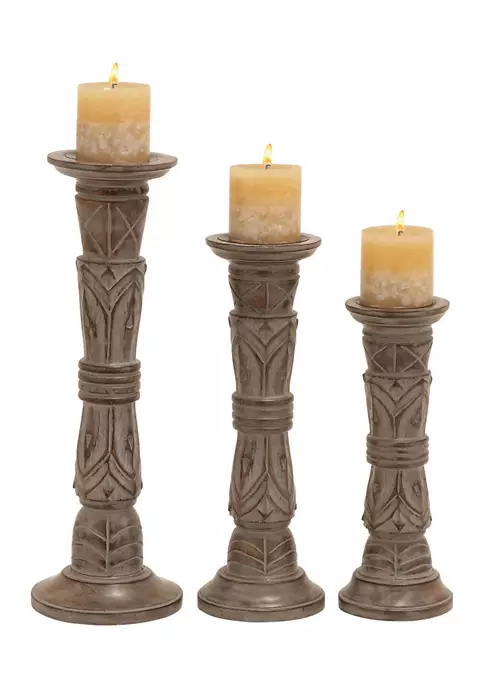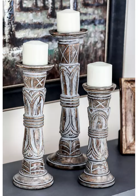 Crafted in a contemporary style that fits great in most homesThis brown candle holder set is composed of solid mango woodThis wooden candle holder set has a light brown finish with a distressed qualityThis pillar candle holder set features elegantly carved designs and rounded tiered basesThis candle holder set of 3 measures 6″L x 6″W x 18″H, 5″L x 5″W x 15″H, 4″L x 4″W x 12″H and collectively weigh 5.85 lbs