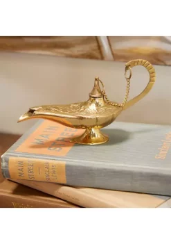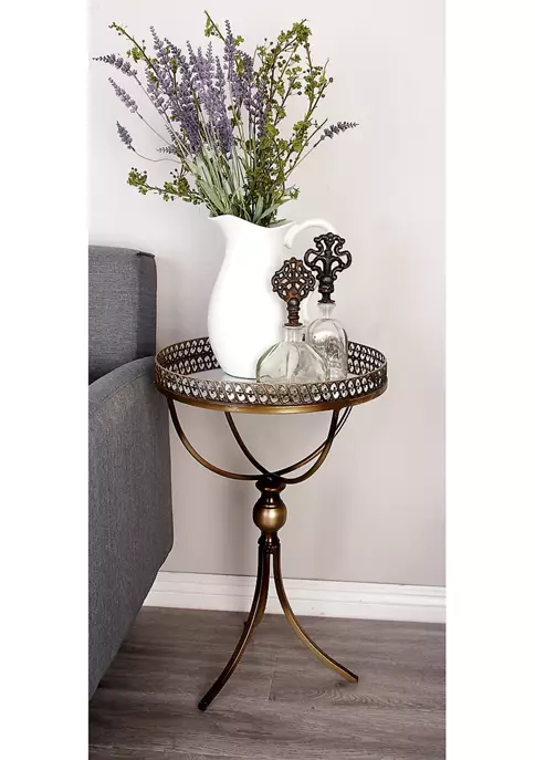 This vintage industrial metal round accent pedestal table in gold brass distressed oil finish and mirror glass counter top featuring scalloped lattice edge treatments.