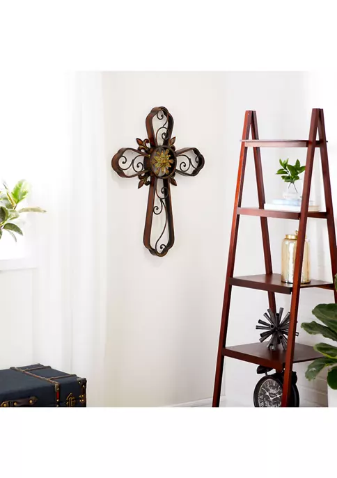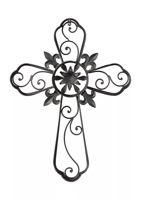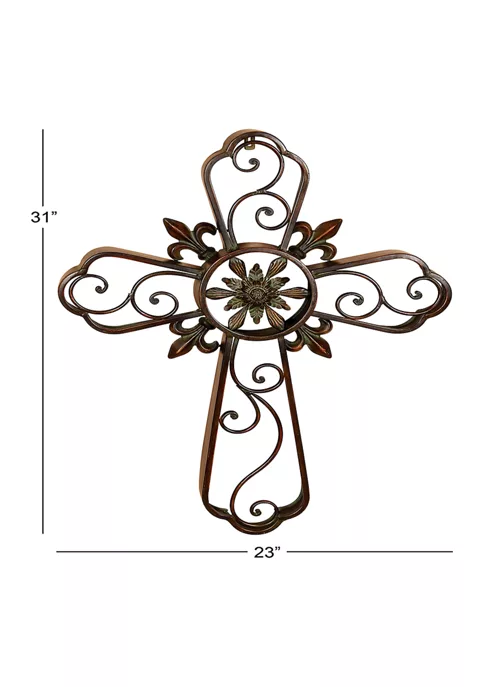 A classic and timeless style of design for your traditional home setting. A cross decoration for wall crafted of solid and textured iron material. This iron cross wall decor has a tarnished brown finish that goes well with earth-toned spaces. Antique style metal cross with mocha brown finish over the 4 points and scrollwork, muted green and brown floral sculpture and fleur de lis accents in and around the center. Large wall cross measures 23″L x 3″W x 31″H and weighs 6 lbs.