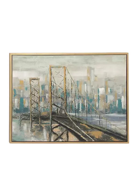A classic and timeless style of design for your traditional home setting. This bridge wall art painting is made of wood, polystone, and canvas fabric materials. This cityscape canvas wall art features a metallic gold-finished frame and a rope bridge painting canvas in black, metallic gold, white, turquoise, light blue, and smoky gray finishes. This splendid bridge canvas painting showcases a blurred cityscape background image highlighting a calm and peaceful rope bridge painting. This piece measures 36″ X 47″ and weighs 8.6 lbs.