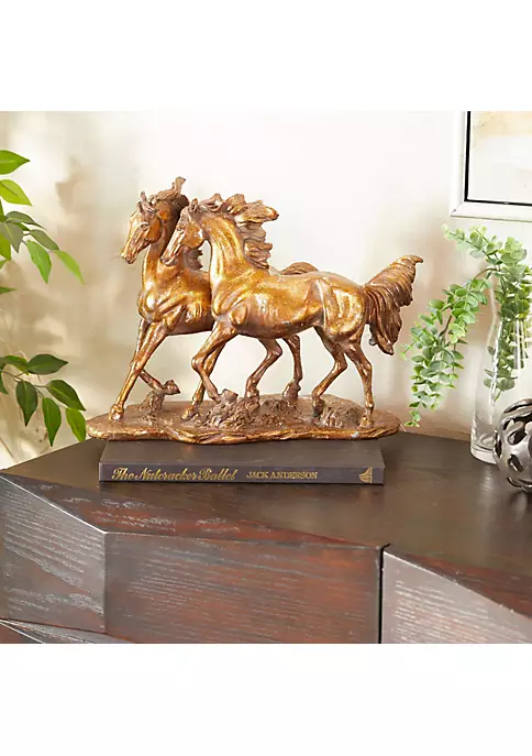 A classic and timeless style of design for your traditional home setting. This decorative object for home is crafted of robust metal that can stand the test of time. A horse inspired polystone sculpture that comes in a distressed bronze finish that complements any traditional interior design. This eye-catching bronze traditional style sculpture features horse-shaped figures in a running position designed with intricate facial features, mane, and tail supported by irregular-shaped base. This item measures 14″L x 6″W x 11″H and weighs 6 lbs