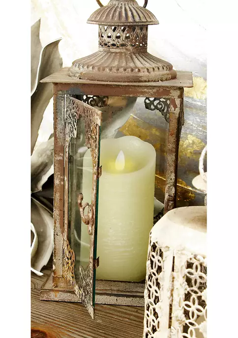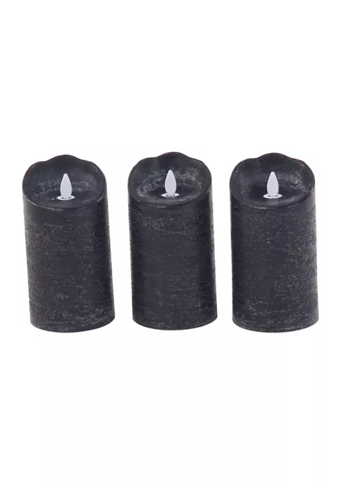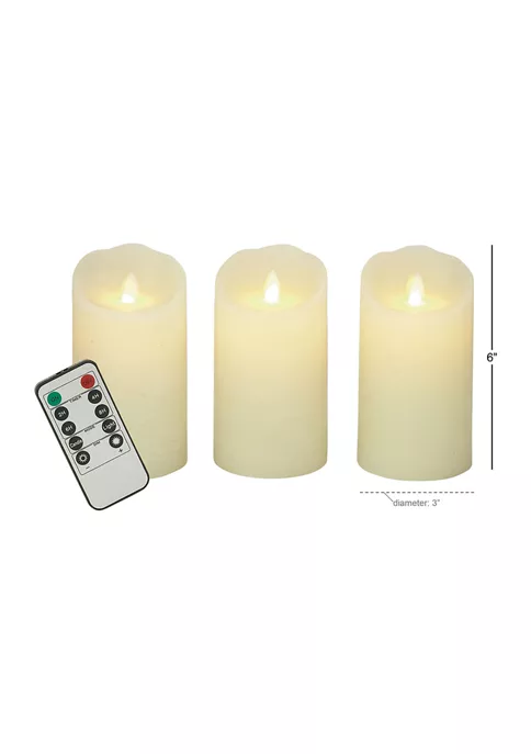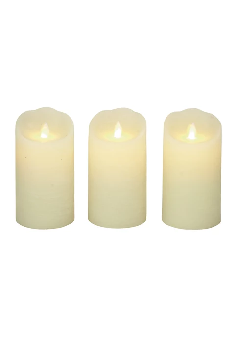 A set of three new traditional flameless wax round pillar candles with remote, it has a textured milky beige wax, a melted side uneven tops, and a white flame for the illusion of a real candle.