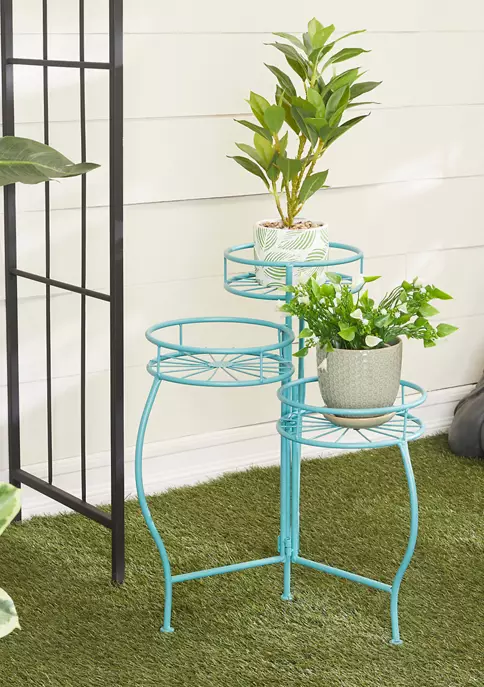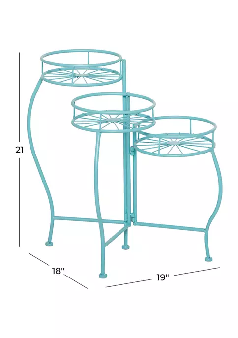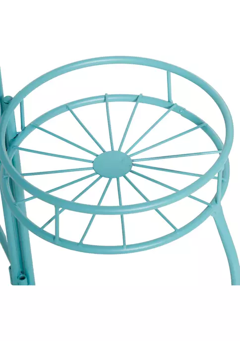 Transitional style features a timeless design with a contemporary update on traditional pieces. Iron structure is painted with a special coating to help protect it from the elements. Iron may show signs of corrosion in salt air environments.. This delightful metal plant stand showcases a polished turquoise iron finish. This endearing outdoor metal plant stand showcases a 3 tier wheel plant stand design with a hinged central body for convenient configuration. This item measures 19.1″L x 18.4″W x 21.5″H and weighs 3 lbs
