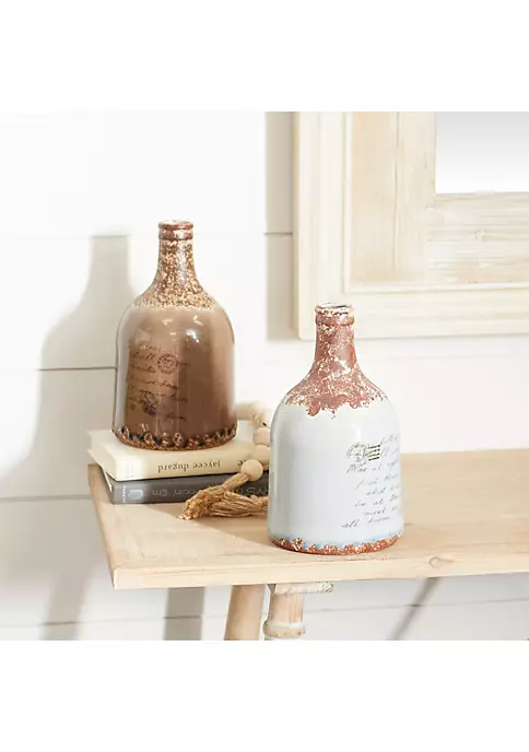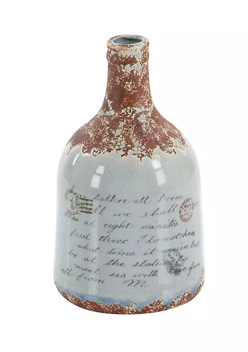 A vintage inspired design brings a sense of the past to your home, for a sophisticated comfort. Made from durable ceramic material. Item features a blue and brown finish. Features post card letters on bottle surface, a narrow spouted opening and wide bottle design. Each item measures 6″L x 6″W x 10″H and weighs 2 lbs