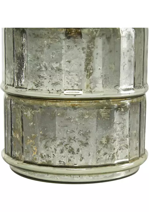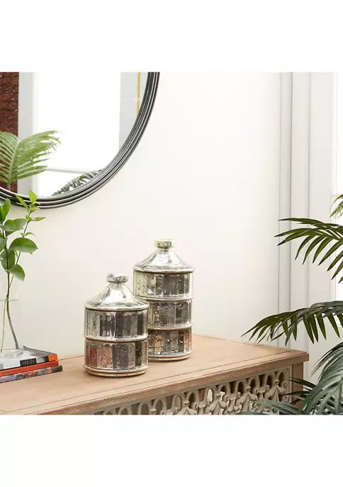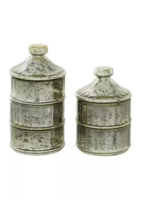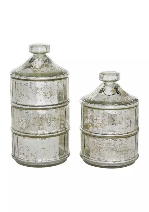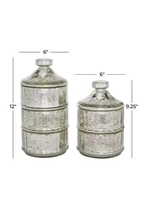 Vintage inspired designs draw inspiration from the past to create a warm and inviting space that is full of personality. Vintage jar set is made from glass materials. Distressed glass look gives off an antique feel with its silver polished finish. Features cylinder shaped jars with sleek look and flat round knob for easy open. Each item measures 6″W X 12″H and 6″W X 9″H; total weight: 7.95 lbs