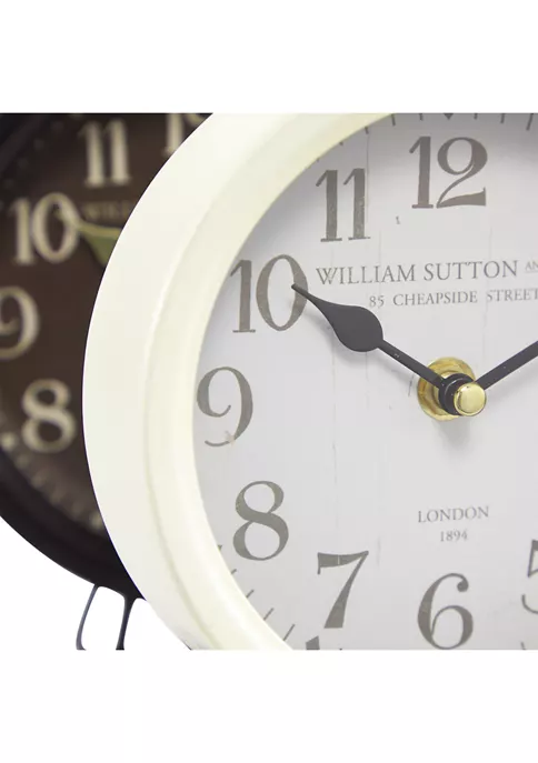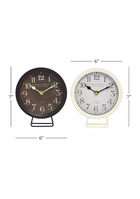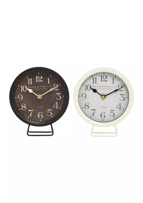 Vintage inspired designs draw inspiration from the past to create a warm and inviting space that is full of personality. This metal table clock is made from solid iron materials. It features two round clocks in black and white finishes. Vintage style inspired design black and white iron table clock set features a timeless appeal with a clean round profile attached to a thin metal leg riser. Each item measures 6โL x 2โW x 7โH; and weights 0.83 lbs