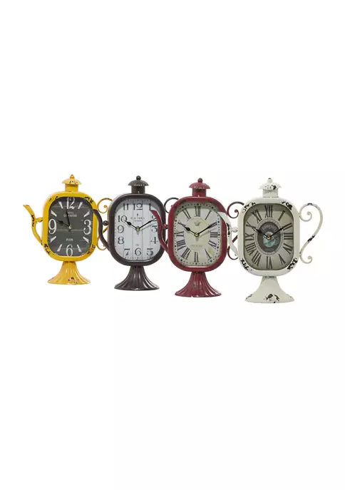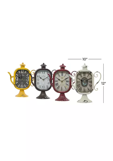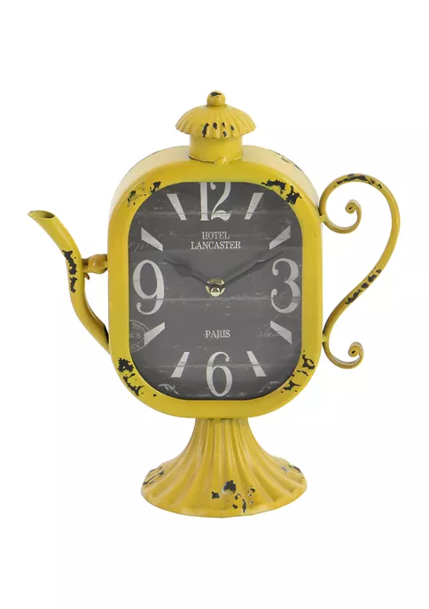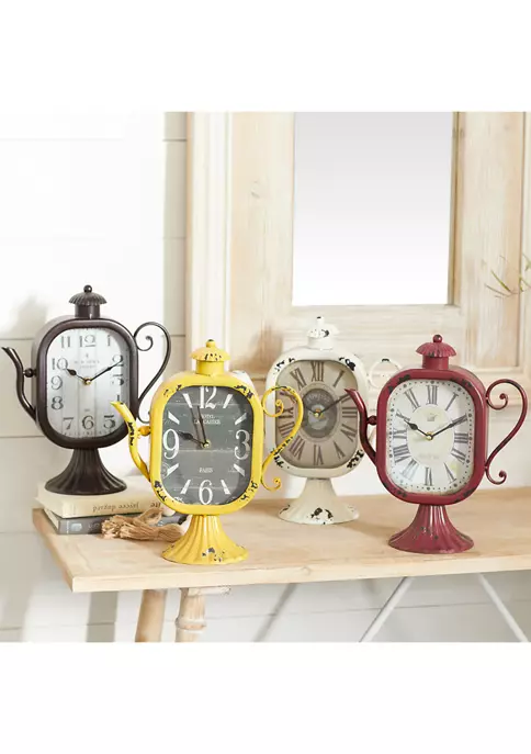 A vintage inspired design brings a sense of the past to your home, for a sophisticated comfort. Each clock has an iron tea kettle design. Teapot inspired table clock carries a distressed and chipped detailing in yellow, black, white and red finish. Features a squared oval frame with medallion and ball finial. Each clock measures 10″L x 5″W x 12″H and weighs 1.87 lbs