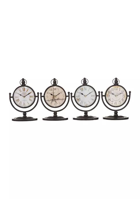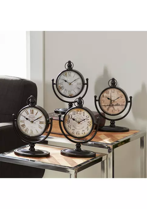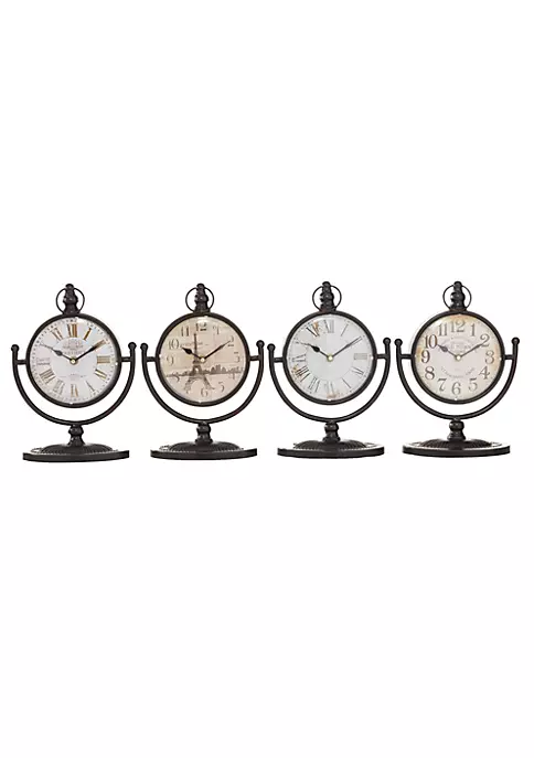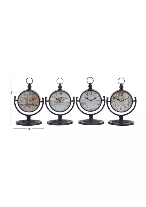 Vintage inspired designs draw inspiration from the past to create a warm and inviting space that is full of personality. Crafted of a solid iron for durability. Black painted finish with distressed white. Set of 4 large, with black painted finish with distressed white and sepia-toned paper clock faces. Set of 4 table clocks measure 8″L x 5″W x 12″H and weigh 1.12 lbs