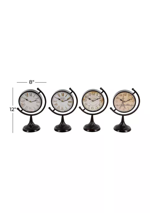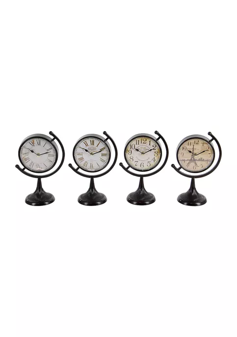 Vintage inspired designs draw inspiration from the past to create a warm and inviting space that is full of personality. Features a set of four round desk clocks made of iron and glass material. Features a round base, iron post, and semi-circle design in textured black finish. This vintage look desk clock comes in a globe type semi circle holder where the main clock is situated in an angle. These each measure 12″ x 8″ x 5″; and together weights 0.99 lbs