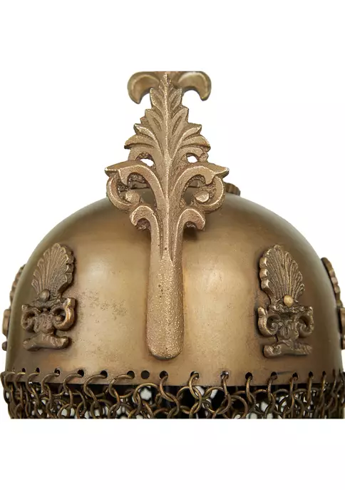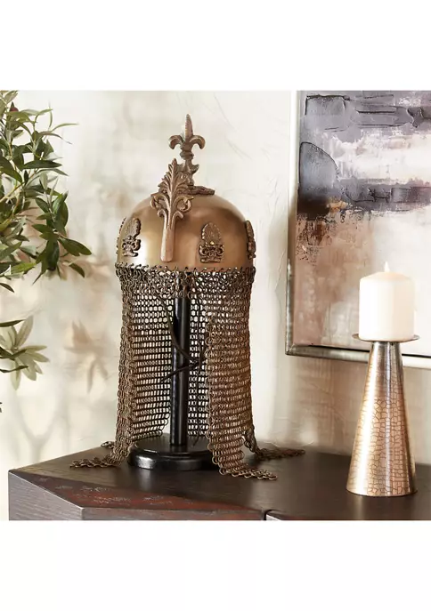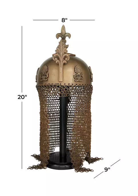 Vintage inspired designs draw inspiration from the past to create a warm and inviting space that is full of personality. Remarkable heirloom decor is made of robust iron and pine wood. Armor helmet highlights an overall brass finish with a soft sheen, and a black wooden base stand. Chainmail is intricately attached to this Ottoman-inspired helmet, adorned with arabesque botanical patterned sculptures for medieval historical charm. Item measures 8″L x 9″W x 20″H and weighs 6 lbs