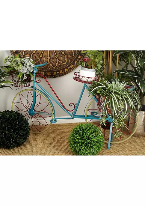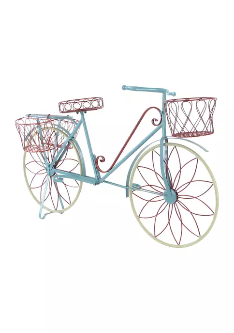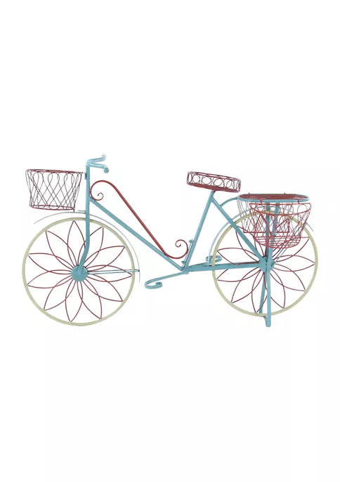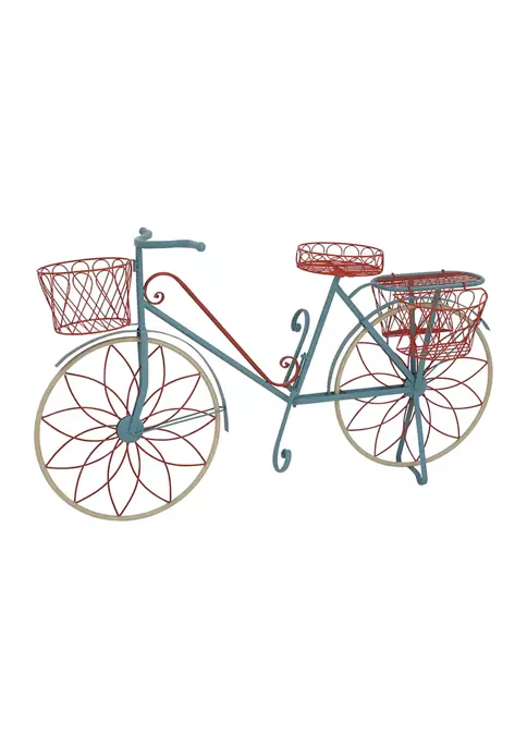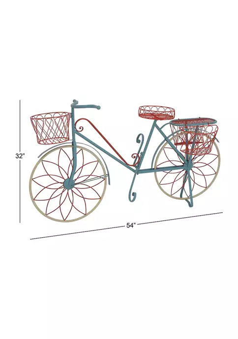 Vintage inspired designs draw inspiration from the past to create a warm and inviting space that is full of personality. The sturdy and slender frame was constructed from solid iron. Glossy paint colors of red, blue, and beige coat the all-metal frame. The decorative construction features realistic parts of the mobile: wheels, pedal, baskets, and seats. It has 5 planter racks in total: 4 baskets and 1 platform. All of which have holes to allow water to drip through. This item measures 54″L x 18″W x 32″H and weighs 24.2 lbs