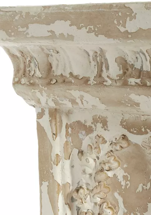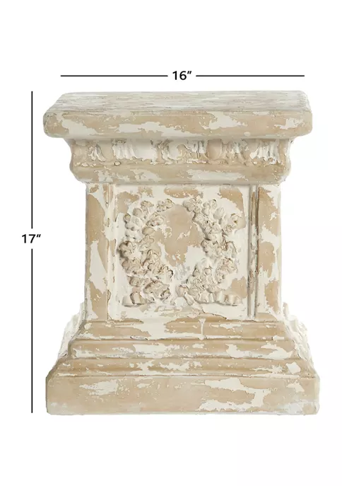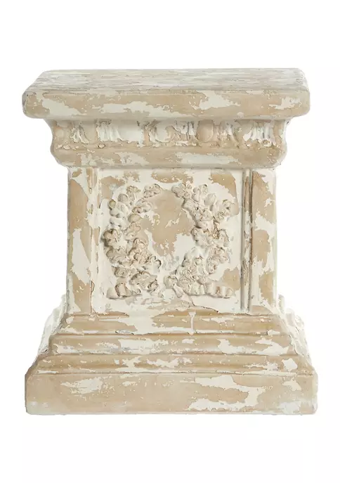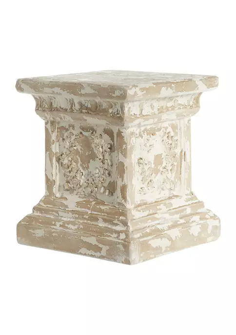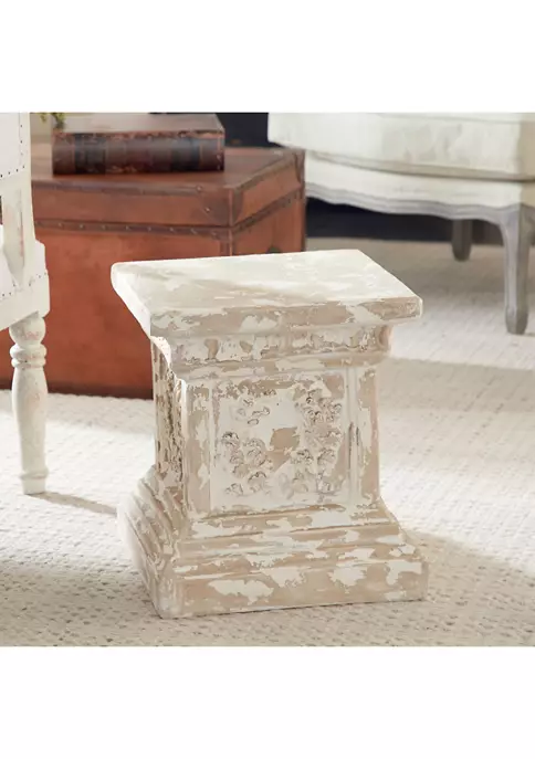 A practical yet stylish upgrade that instantly elevate the look of your room. Display your plants, decor or your favorite art piece on this beautifully crafted pedestal table. This accent table is great for vintage and French country home themes. Designed with protective stoppers at the base that prevent scratching furniture and table tops, as well as sliding around. This item ships in 1 carton. Elegant pillar accent table with floral relief patterns. Suitable for indoor use only. Maximum weight limit is 50 lbs. Vintage theme.