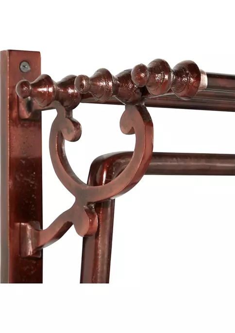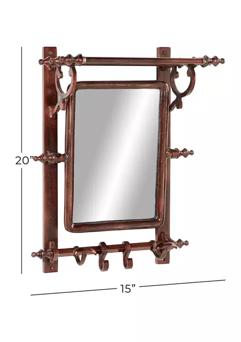 Solid aluminum and copper constructionAntique and decoratively-worn metallic copper finishFeatures a towel rack, 4 metal hooks, and a rectangular mirror