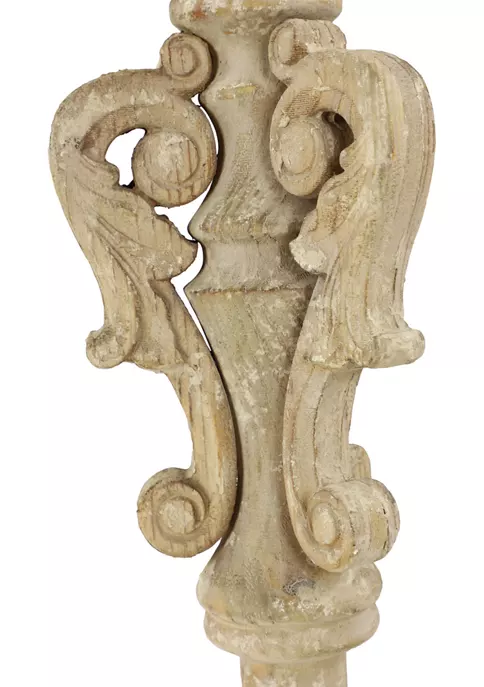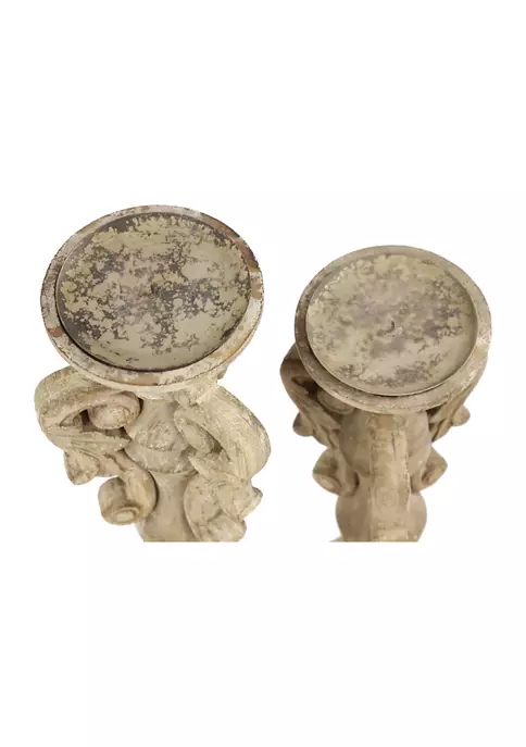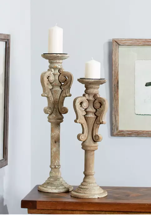 This set of 2 decorative candlesticks measure 7 in L x 7 in W x 27 in H and 7 in L x 7 in W x 22 in H and collectively weigh 9.05 lb
